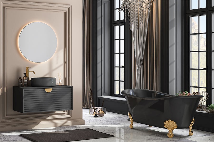 Poti opta pentru un look total Black , impodobit cu accente metalice de aur si argintiu, si cu blaturi si gresie din marmura pentru un aspect de baie de lux.