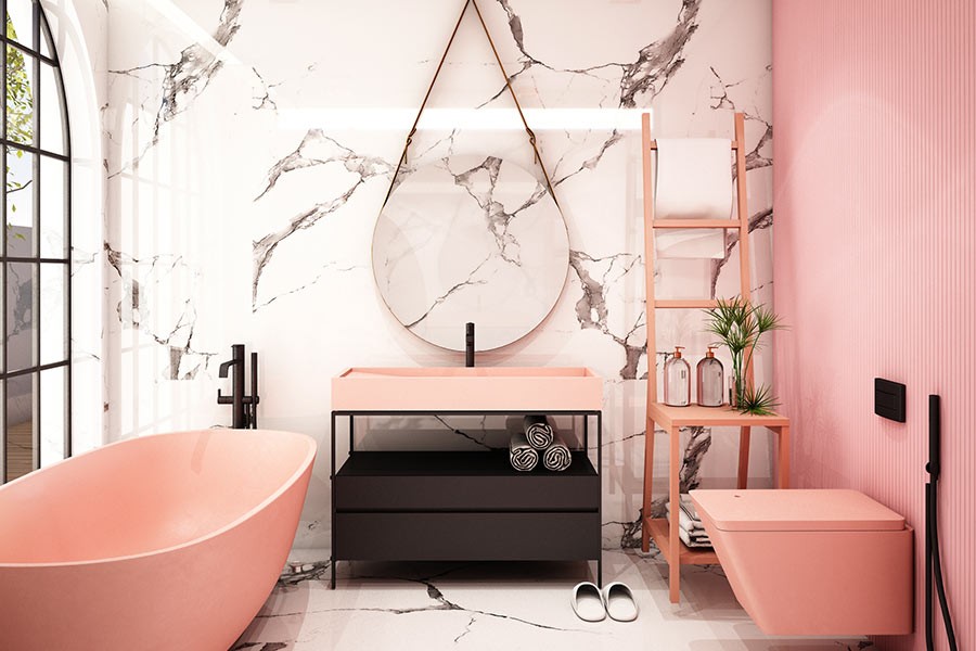 Dar este si o alternativa interesanta pentru un stil de baie modern minimalist, daca este combinat cu negru, sau romantic, daca este combinat cu roz.